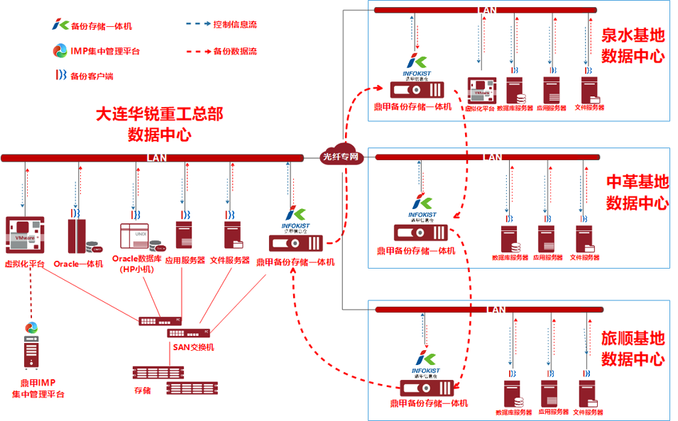 此前,大連華銳重工集團的備份系統版本老舊,功能單一,已無法滿足大連華銳現有數據的不斷增長、業務類型繁多的本地和異地的數據保護需求,客戶亟需一套專業的數據保護系統,對重要核心數據進行周期性的定時本地集中自動化備份和異地數據容災保護,避免數據丟失、損壞導致的業務系統停頓以及本地災難性事件導致數據丟失損壞的風險。