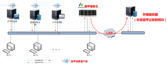 ◆ 在海大災備中心部署鼎甲DBackup備份存儲系統,通過鼎甲的存儲節點復制技術,將本地備份系統數據自動分時限速地上傳到災備中心的鼎甲DBackup備份存儲系統;