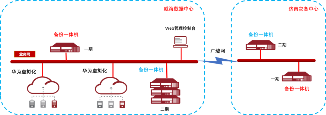 2、雙中心容災(zāi)解決方案:在威海、濟南兩個數(shù)據(jù)中心之間統(tǒng)一管理,采用鼎甲數(shù)據(jù)備份和管理軟件,將區(qū)縣政府業(yè)務(wù)系統(tǒng),通過云平臺接口統(tǒng)一備份到鼎甲備份一體機上后,將重要備份數(shù)據(jù)異步傳輸?shù)綕蠟?zāi)備中心,實現(xiàn)數(shù)據(jù)級容災(zāi)。