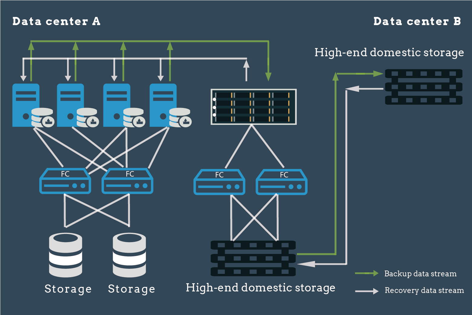 Deploy appliances in the disaster recovery center to realize asynchronous synchronization with the other data center, backup data in the local backup media will be transferred to the other local center for off-site backup and avoid potential data loss.